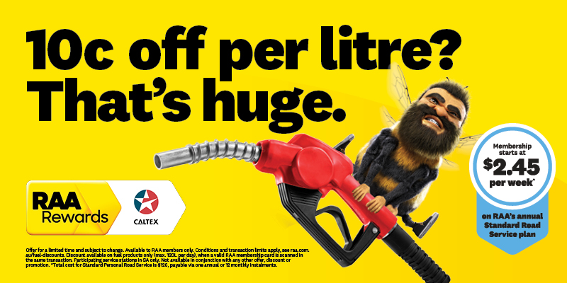 *Offer for a limited time and subject to change. Available to RAA members only. Conditions and transaction limits apply, see raa.com.au/fuel-discounts. Discount available on fuel products only (max. 120L per day), when a valid RAA membership card is scanned in the same transaction. Participating service stations in SA only. Not available in conjunction with any other offer, discount or promotion.