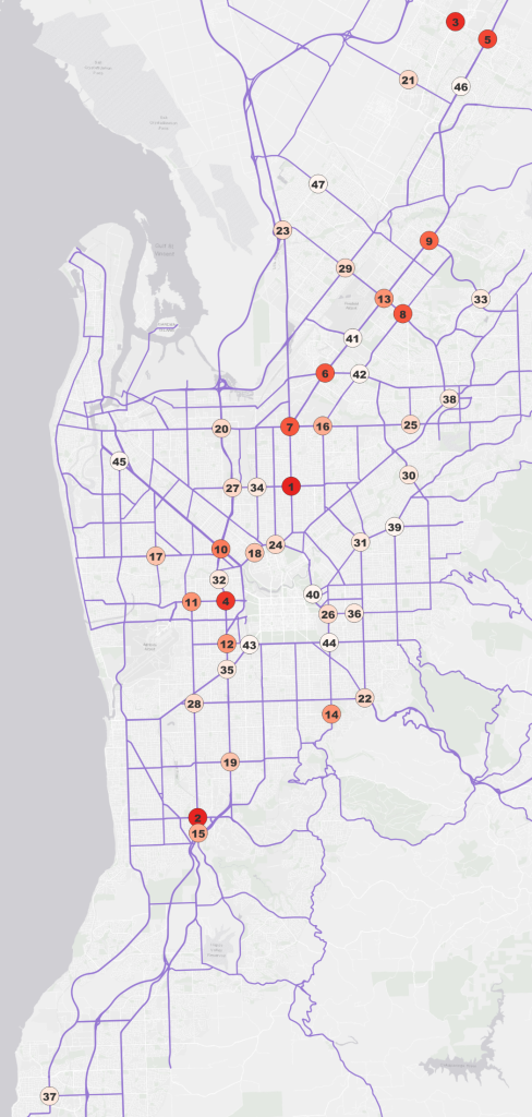| 43rd | Anzac Hwy / Richmond Rd / Greenhill Rd | 15 | 76,550 |